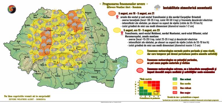 ⛈️ Din cursul amiezii de astăzi (5 august), la început în majoritatea zonelor montane și submontane, apoi şi în Transilvania, nord-vestul Moldovei, nordul Munteniei și nord-estul Olteniei, iar seara și în estul Maramureșului, gradul de instabilitate atmosferică va fi temporar accentuat. Acesta se va manifesta prin perioade cu averse – ce pot avea și caracter torențial, descărcări electrice, intensificări de scurtă durată ale vântului, pe alocuri cu aspect de vijelie (rafale de până la 55-70 km/h) și izolat* grindină de mici sau medii dimensiuni (diametrul maxim ~ 1-2 cm). În intervale scurte de timp sau prin acumulare, cantitățile de apă vor depăși local* 15-20 l/mp, iar punctiform* 25-35 l/mp.