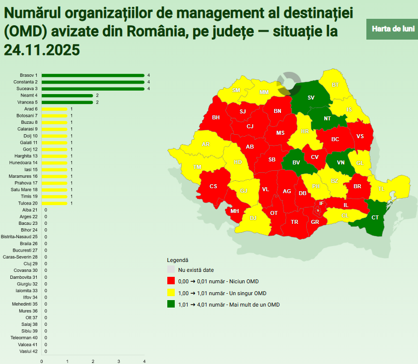 Peste jumătate dintre județe nu au niciun OMD avizat, situație vizibilă atât în zone cu potențial turistic redus, cât și în județe cu resurse turistice, unde procesul nu a avansat deloc.