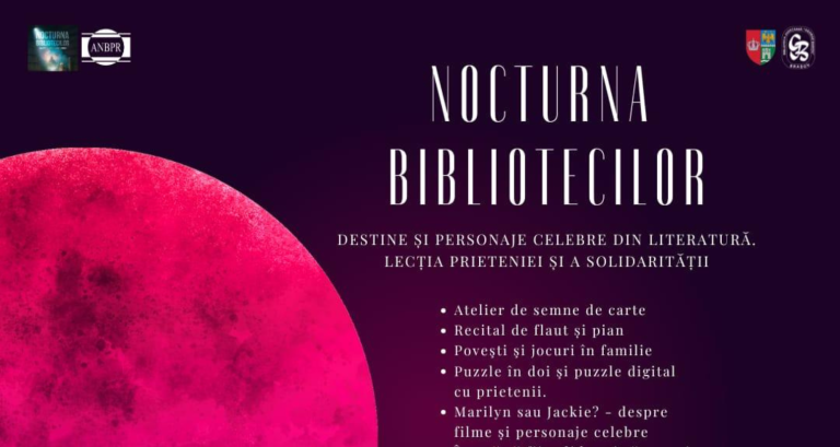 Sâmbătă, 27 septembrie 2025, începând de la orele 18,00, vă invităm la Nocturna Bibliotecilor la Braşov. Activităţile şi evenimentele se vor desfăşura în sediul central al bibliotecii şi în Casa Baiulescu, din Livada Poştei, precum şi la Filiala 3 ( Str. Soarelui nr. 6, parter) și Filiala 4 (strada Berzei nr 2, parter).