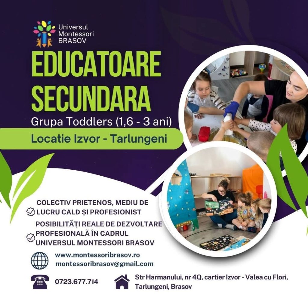 La Universul Montessori, suntem în căutarea unei Educatoare Secundară caldă și implicată pentru grupa Toddlers (1,6-3 ani), la sediul din cartier Izvor – Valea cu Flori, Tarlungeni, Brasov.